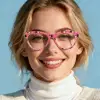 Oh, you’ll love this pair of eyeglasses! They come in a sweet pink color with a full-rim design, giving off a balanced, approachable vibe. Made of premium acetate, they’re super light at just 22g—super comfy for all-day wear. With handy spring hinges, they fit medium PD 62-66 perfectly and work with progressive lenses. Great for office work, daily errands or casual coffee dates, they blend style and practicality effortlessly!