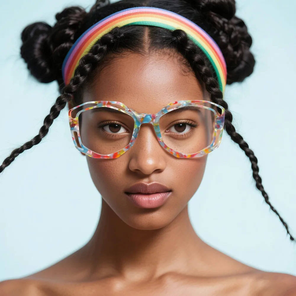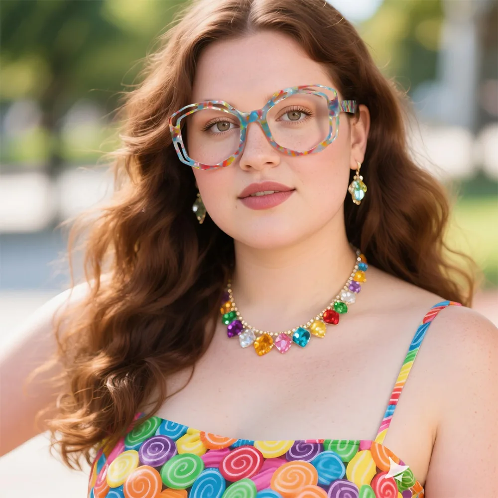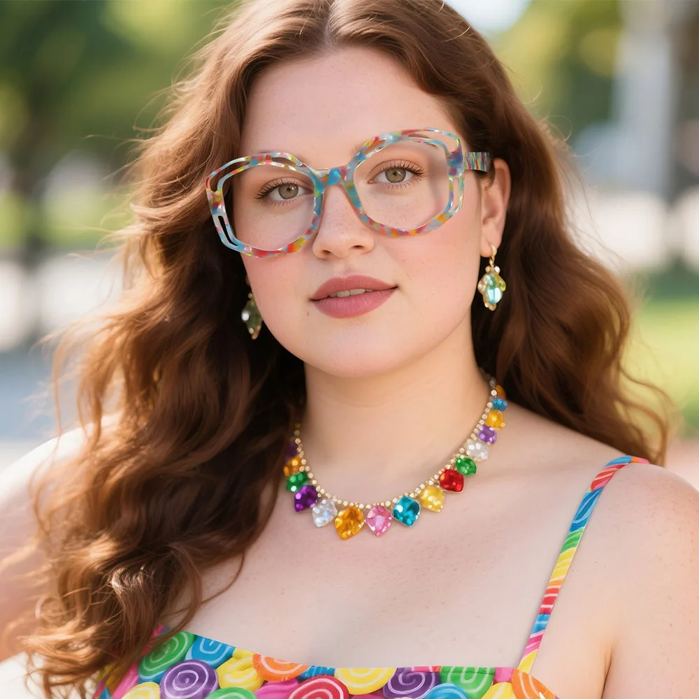 Make a bold statement with these eye-catching glasses! Featuring a vibrant multicolor geometric design, these irregular-shaped frames are anything but ordinary. The gorgeous acetate construction offers both style and durability, while the spring hinges ensure a comfortable, customized fit. Perfect for fashion-forward individuals who love to stand out, these glasses add a playful yet sophisticated touch to any outfit. Whether you're heading to a creative workspace, a weekend brunch, or a night out, these unique frames will turn heads. The balance of bold colors and geometric flair makes them a must-have accessory for those who dare to be different!