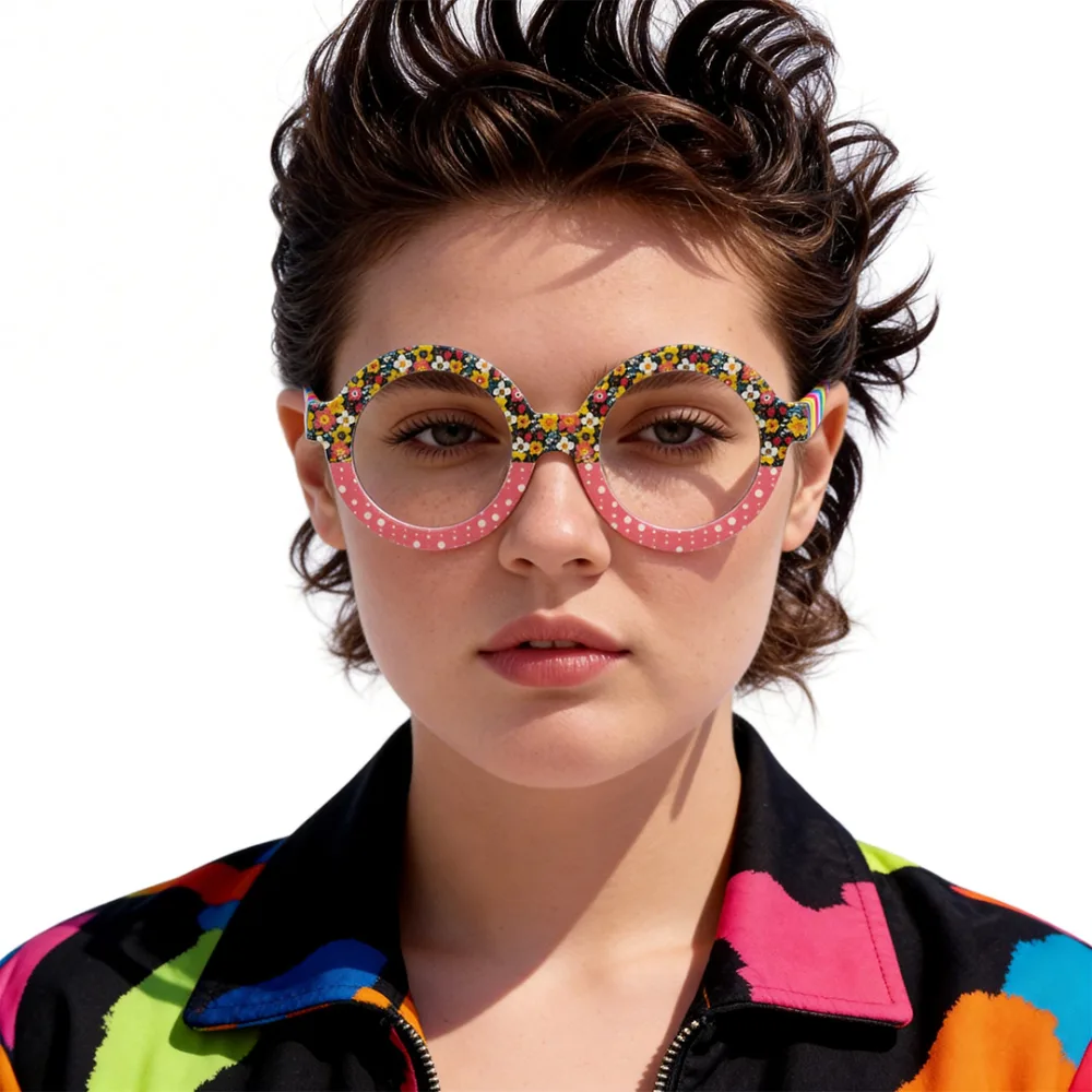 Oh, these eyeglasses are total eye-catchers! They come in a lovely pink_floral color with a full-rim design, giving off a balanced, fresh vibe. Made of TR90, they weigh 27g—light enough for all-day comfort. With spring hinges, they fit medium PD 62-66 perfectly and work with progressive lenses (great for both myopia and presbyopia). Perfect for office work, daily errands or casual hangouts—stylish and super practical!
