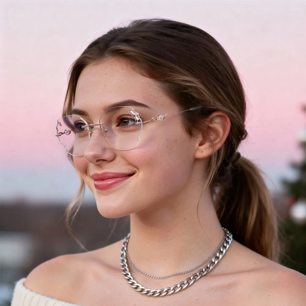 These eyeglasses are a perfect blend of luxury and fun! With a frameless design and diamond-cut edges, the lenses sparkle with finesse. The rhinestone detailing along the edges adds a touch of glamour, while the heart-shaped temples offer a unique, playful twist. Ideal for those special nights out or just adding a dash of charm to your daily look, these glasses make a statement. Whether you're attending an elegant event or enjoying a casual gathering, these frames will elevate your style effortlessly with their refined yet quirky design.