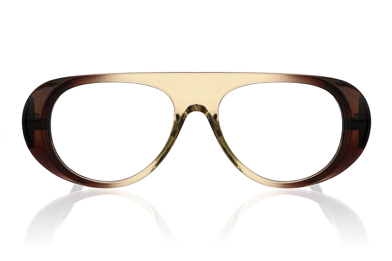 Lenses that darken (gray/amber) when exposed to outside light and remain clear inside